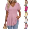 Women's Solid Color V-neck Loose Short Sleeved Pleated T-shirt Top