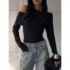 H Family European and American Women's Clothing Abstinence Dark Asymmetrical off-Shoulder Cross Tops Sexy Patchwork Black Primer T-shirt