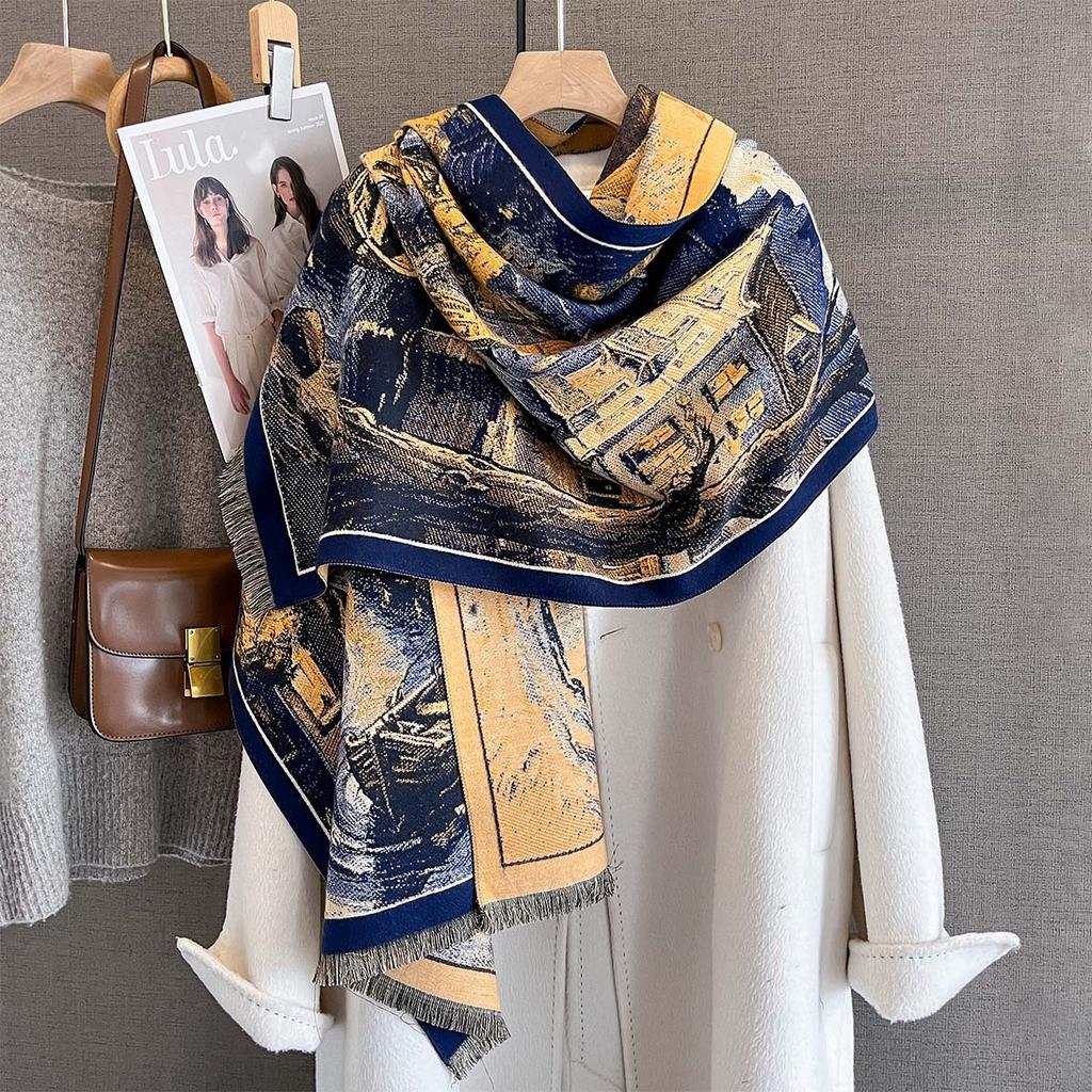 185*68cmWinter Retro Oil Painting Print Cashmere Feel Pashmina Women Outdoor Warm Large Shawls Wraps Tassels Lady Bufanda Poncho