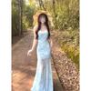Purple floral mesh suspender dress women's summer seaside vacation temperament waist hip fish tail dress