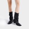 Fashion New Retro Boots Popular Flame Rivet Pleated Knight Boots Women Pointed Toe Chunky Heel Belt Buckle Black Leather Mid Calf Boots