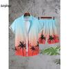 Adding a tropical touch, this man's Hawaiian shirt set features a vibrant floral plant print and an elastic waist drawstring for easy and comfortable wear.
