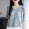 Summer New Retro Jacquard Knitted T-shirt, Blue V-neck Knitted Sweater, Short Sleeve